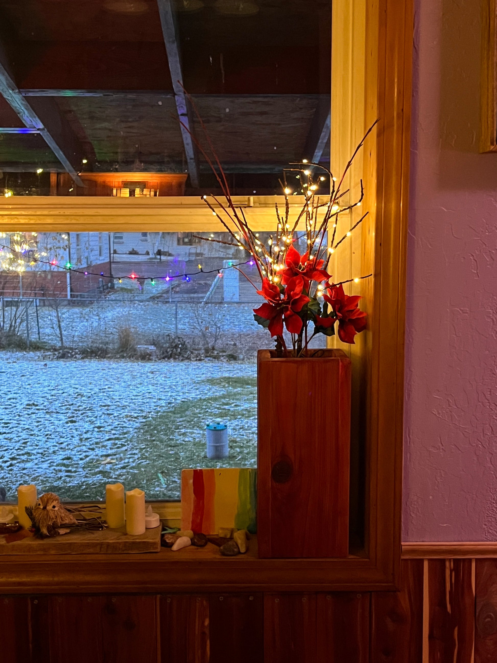 This is battery powered dogwood lamp that can be put anywhere on a windowsill without dealing with a chord. The base is handmade cedar, painted with oils in red tones. The light has a timer and "on" setting. There are other spots in the vase to exchange for spring flowers or dried flowers. The pine vase is roughly 15"x4"width. Whole item with the light is roughly 19" -20" tall with plants. The lighted dogwood branches can be bent to whatever shape. (other flowers and dogwood included)