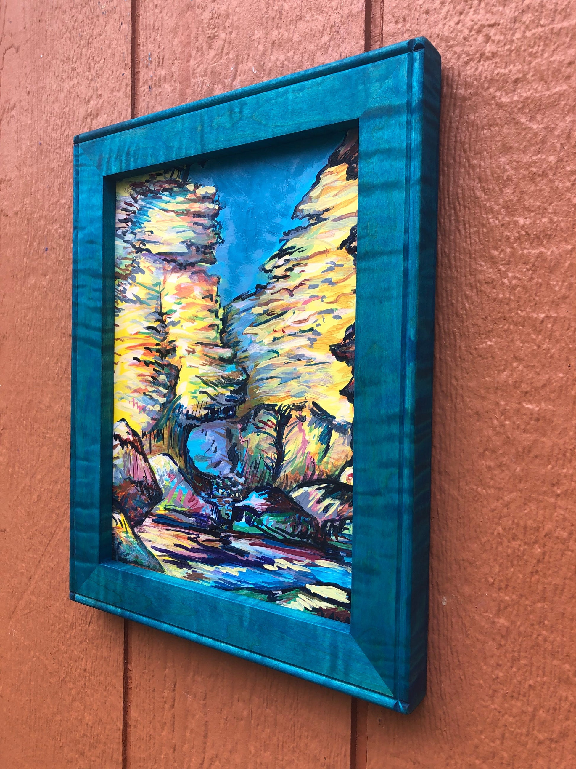 Original Acrylic on Clayboard: Framed in beautiful teal handmade frame/no glass 9"x12" image size (approx 11"x13" framed: depicted in pics w orange backround