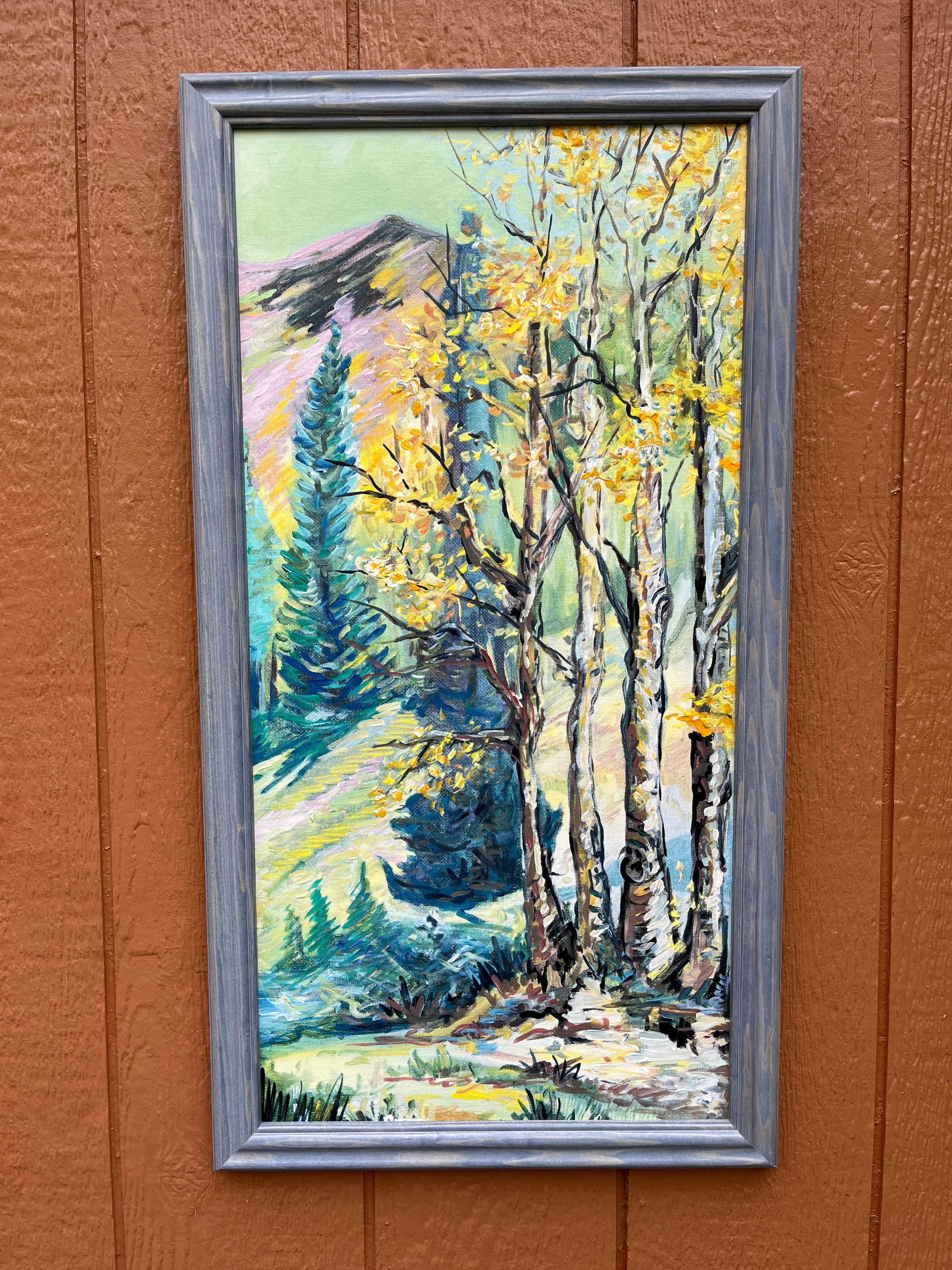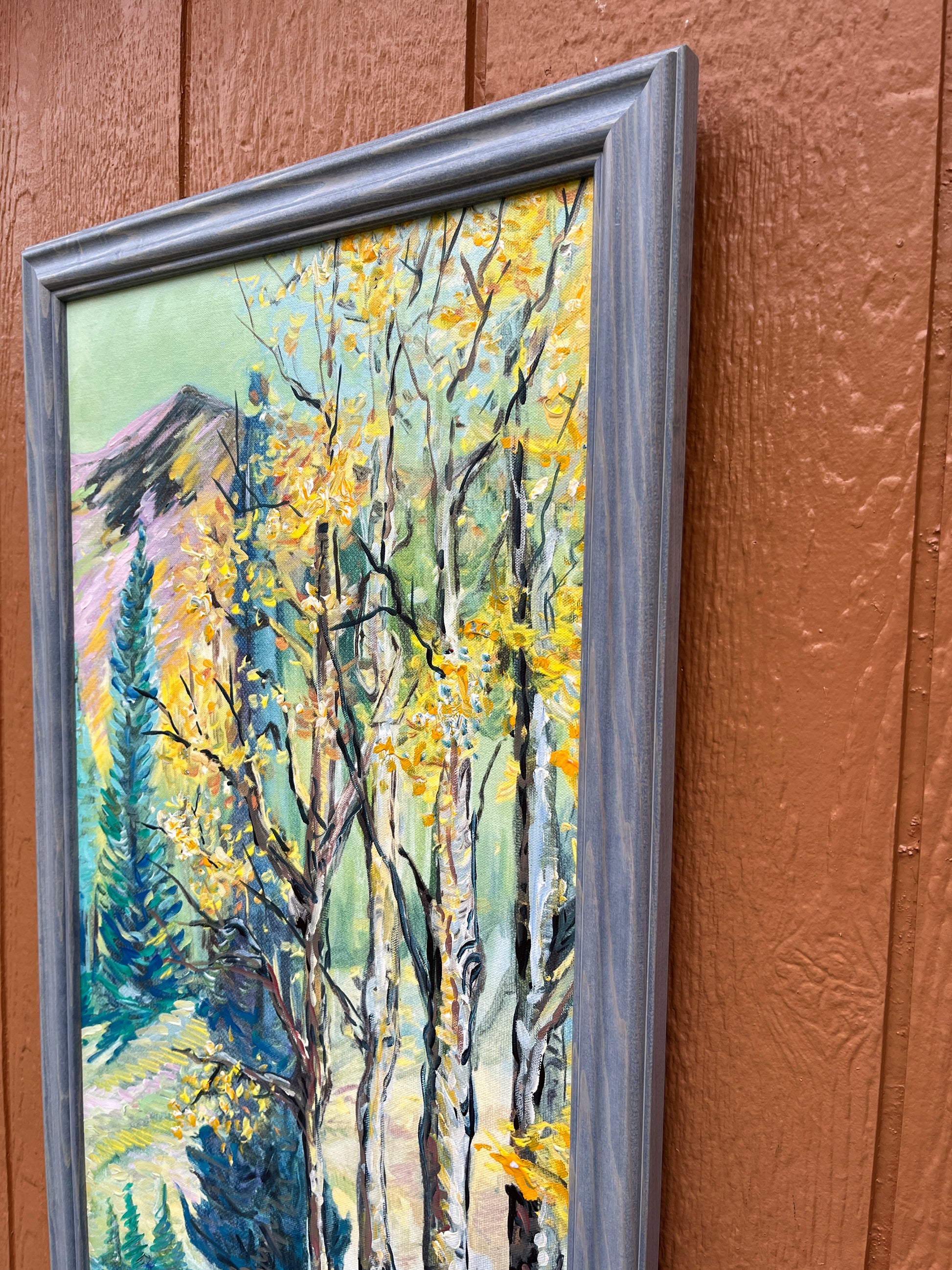 Canvas 15"x30 framed in blue frame is ready to ship. This is a embellished canvas giclee that is archivally mounted on acid free foam and then framed. There is no glass, so it has the look and feel, texture of the original work. This piece is signed and numbered as well as embellished with acrylics.