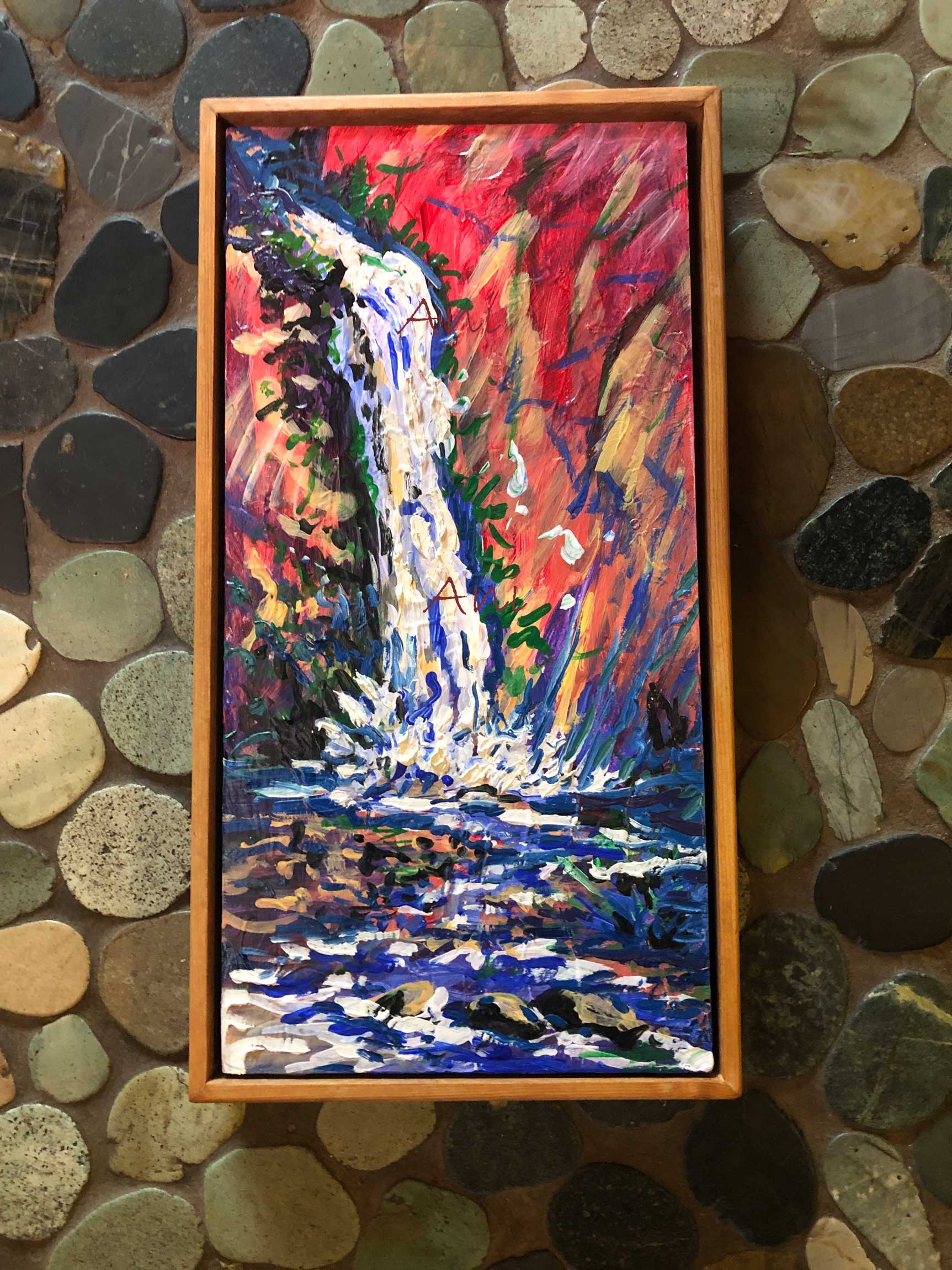 Original Acrylic on on Birchwood with handpainted sides, stained back of frame. Original measures 6"x12"